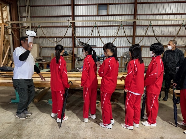 山で伐採した木がどのような過程で製品となるのかを近大中学校3年生の生徒さんたちが学びました。