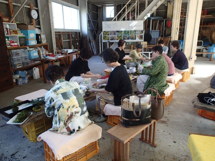 開会式後、苔の重要性、使用する苔の種類等のレクチャー後、各自好みの苔を使い、いろいろな苔玉を作られました。